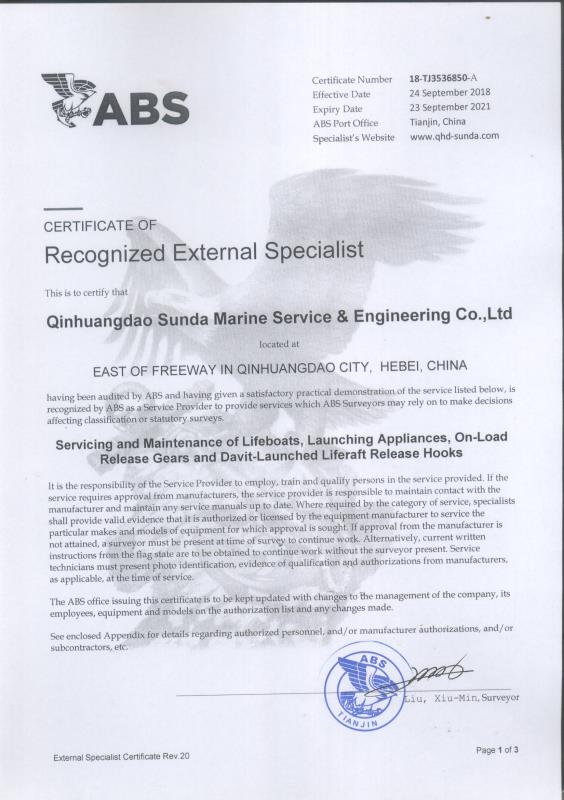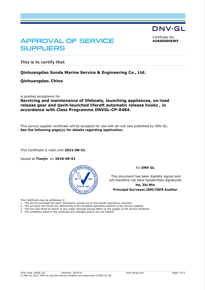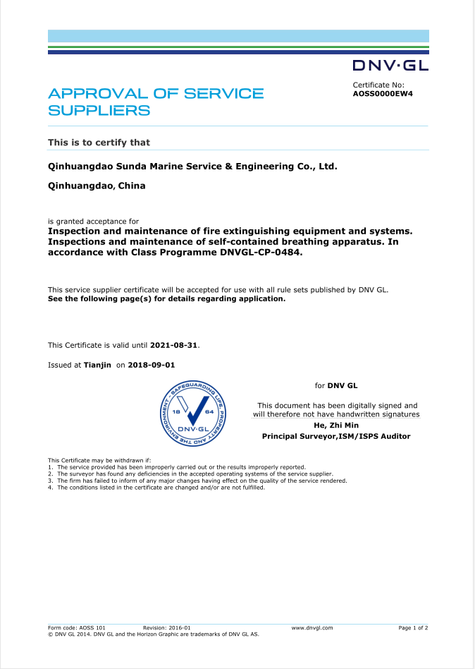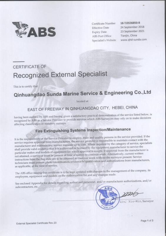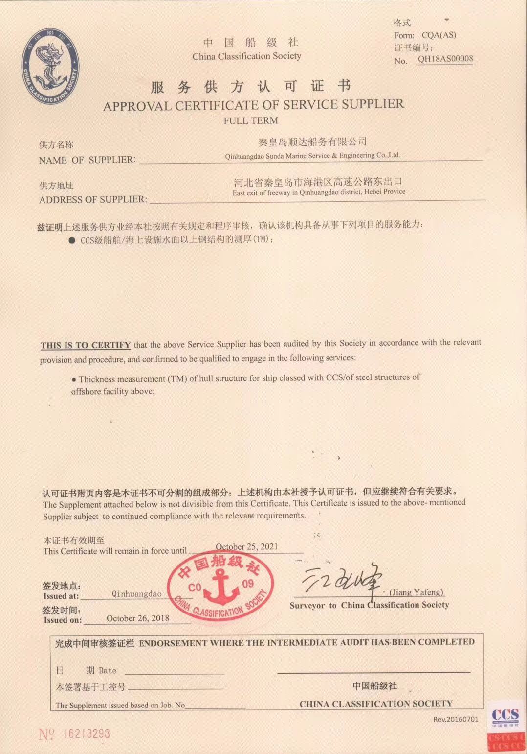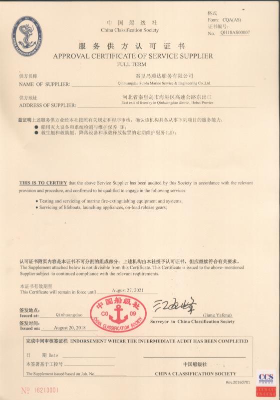 秦皇島順達(dá)船務(wù)有限公司位于美麗的海濱城市、中國北方著名的能源輸出大港--秦皇島。公司從事于船舶修理、物料供應(yīng)、水下檢測、船體測厚、消防救生設(shè)備及救生艇檢驗(yàn)、電氣自動化修理等服務(wù)。 公司自1997年成立至今,先后為國內(nèi)外船東修理、檢驗(yàn)各類船舶萬余艘,積累了豐富的施工經(jīng)驗(yàn)。公司現(xiàn)有場地100余畝,員工30余人,以及工程用車若干臺。我們公司一直本著嚴(yán)以律己、真誠待人、精益求精、信譽(yù)至上的經(jīng)營理念,以優(yōu)質(zhì)的服務(wù)、專業(yè)的施工、合理的收費(fèi),得到了國內(nèi)外船東的廣泛認(rèn)可,贏得了良好的口碑和信譽(yù)。 公司已取得了中國船級社(CCS)、美國船級社(ABS)、日本船級社(NK)、德國船級社(DNV GL)等各個船級社的消防救生和救生艇檢驗(yàn)資質(zhì), ...